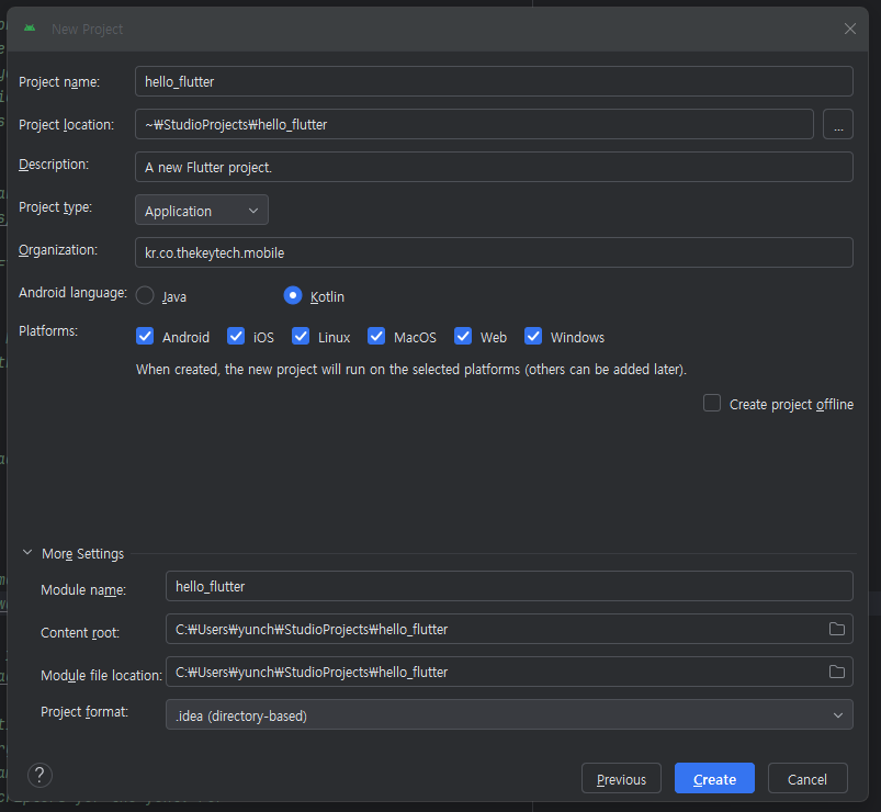 - Project name: hello_flutter (프로젝트 이름)