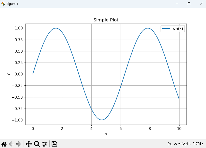 이 코드는 0에서 10까지의 범위에서 사인 함수의 그래프를 그립니다. plt.plot() 함수를 사용하여 선 그래프를 그리고, plt.title(), plt.xlabel(), plt.ylabel()을 통해 각각 플롯의 제목과 x, y축의 라벨을 설정합니다. plt.grid()는 그리드를 추가하고, plt.legend()는 범례를 표시합니다.
