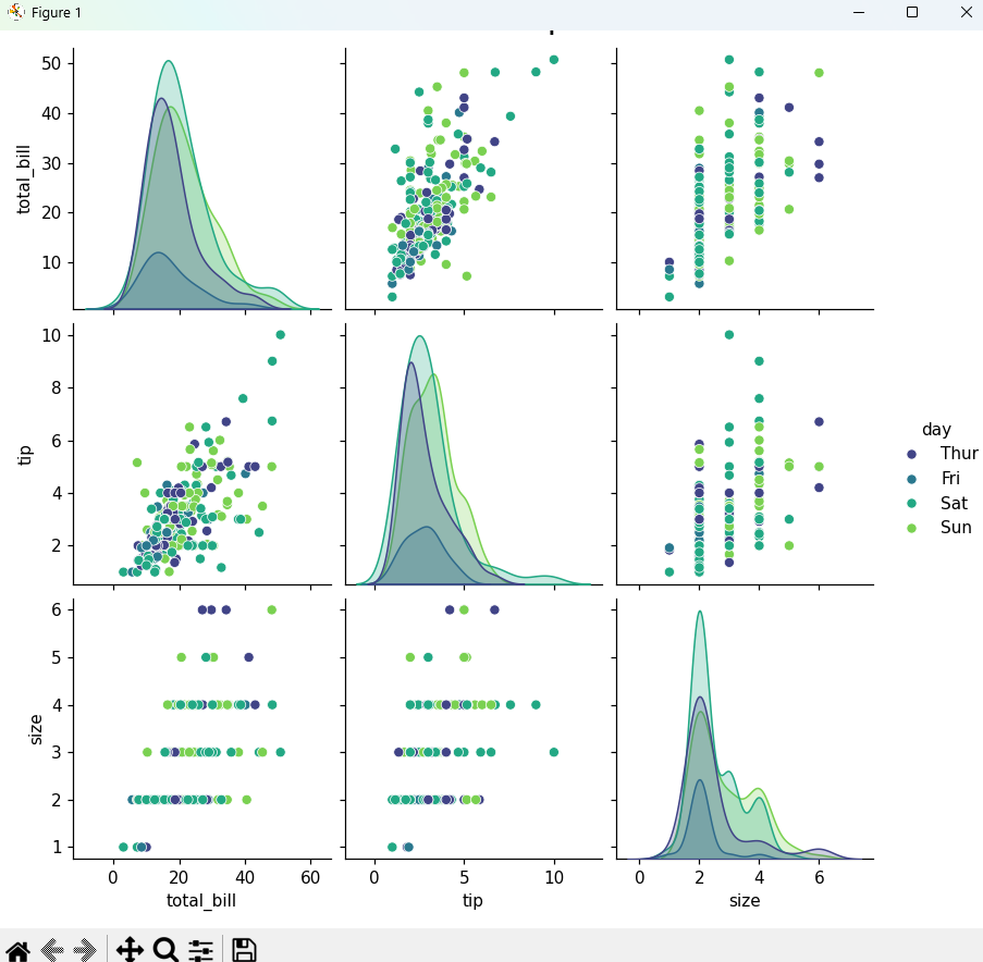 이 코드는 Seaborn의 load_dataset 함수로 tips 데이터셋을 로드하고, pairplot 함수를 사용하여 변수 간의 관계를 그립니다. hue 파라미터는 'day' 변수에 따라 다른 색상으로 각 포인트를 그리게 하고, palette는 색상 스키마를 지정합니다. plt.suptitle()을 사용하여 전체 플롯의 제목을 추가합니다.