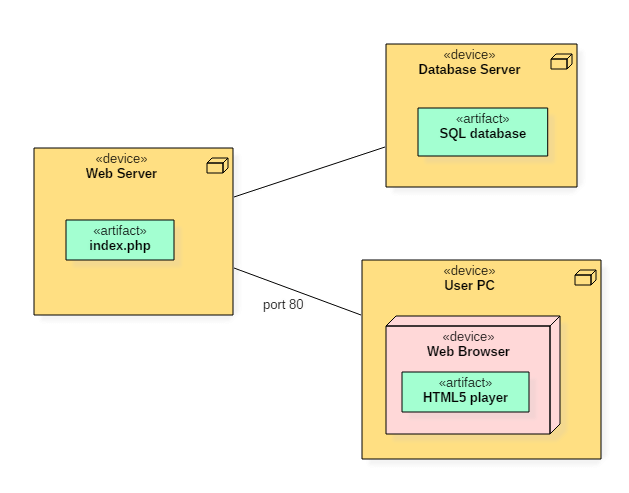 • 배치 다이어그램 (Deployment Diagram): 소프트웨어가 실행되는 하드웨어 노드와 노드 간의 통신을 표현하는 배치 다이어그램 (Deployment Diagram)을 포함합니다.